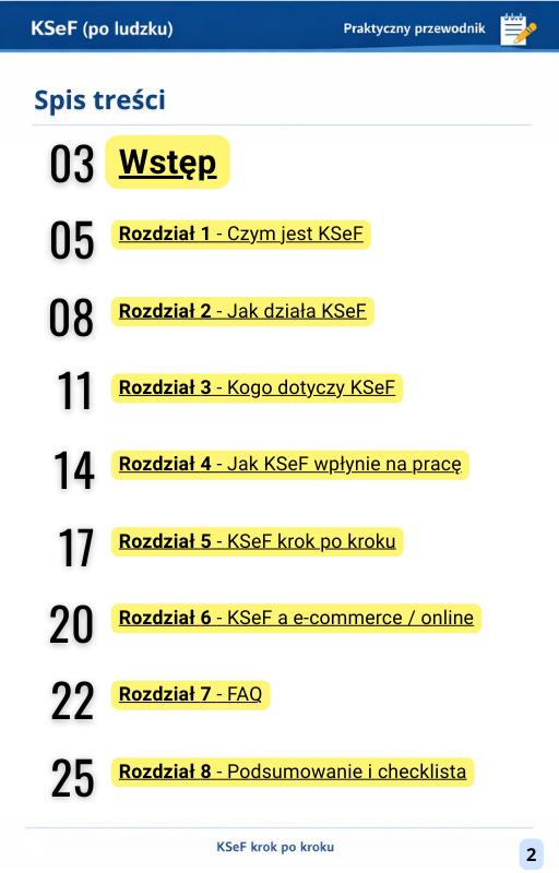 Answer 2: This e-book is ideal for entrepreneurs, especially those running sole proprietorships or small businesses, who issue invoices and are involved in e-commerce. You will learn about what KSeF is, its requirements, and how to prepare your business for compliance without stress.